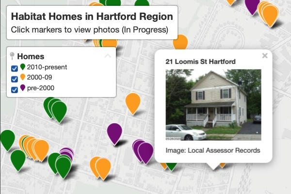 We compiled and mapped over 250 homes for lower-income families created during the past three decades with the Hartford-area branch of Habitat for Humanity.